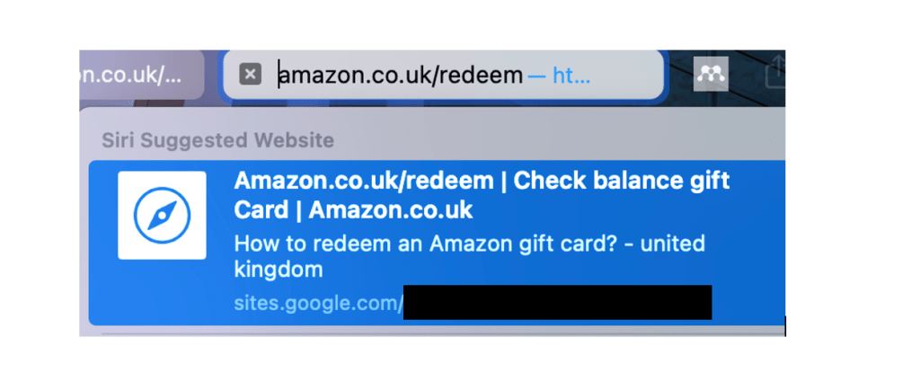 When you type “amazon.co.uk/redeem” in Safari’s search bar, it would automatically redirect you to phishing site, as suggested by Siri with NO warning.